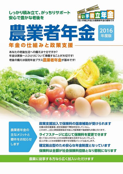少子高齢時代を先取りした農業者年金制度の魅力やメリット、政策支援を受ける要件などを紹介した、加入推進用の農業者向けのリーフレットです。