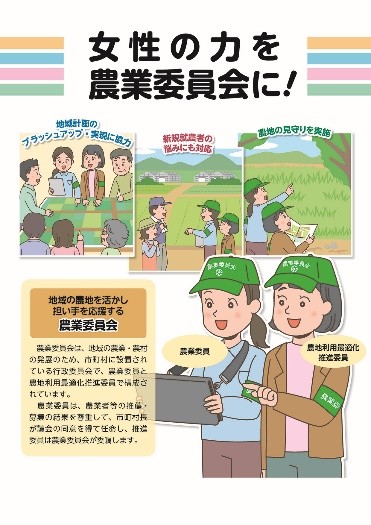 農業委員に占める女性の割合を30%とすることが目標として設定されている第5次男女共同参画基本計画や女性員のネットワークの説明に加え、農業委員会の役割、農業委員・農地利用最適化推進委員の業務についても掲載しております。
