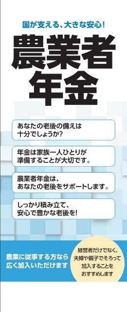 農業者年金の魅力・メリット、政策支援を受ける要件などをやさしく紹介。戸別訪問による加入推進活動などの際に、手元で開きながら説明できるポケットサイズ(タテの長さはB5判・開いた状態でのヨコの長さはA4判)のパンフレットです。